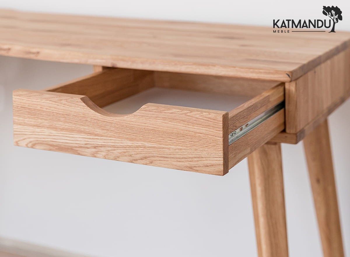 Jako producent mebli drewnianych dokładamy starań, aby nasze produkty były najwyższej jakości. Tak jest również w przypadku biurka skandynawskiego. Do jego produkcji wykorzystaliśmy trwałe i wytrzymałe drewno dzikiego dębu, które cechuje się ponadprzeciętną trwałością. To, dlatego uzyskaliśmy stabilny mebel, mimo oszczędnej, minimalistycznej konstrukcji. Biurko dębowe zachwyci Cię sękami i słojami, które dodatkowo podkreśla olejowanie, któremu poddano mebel.