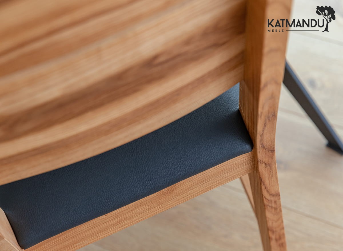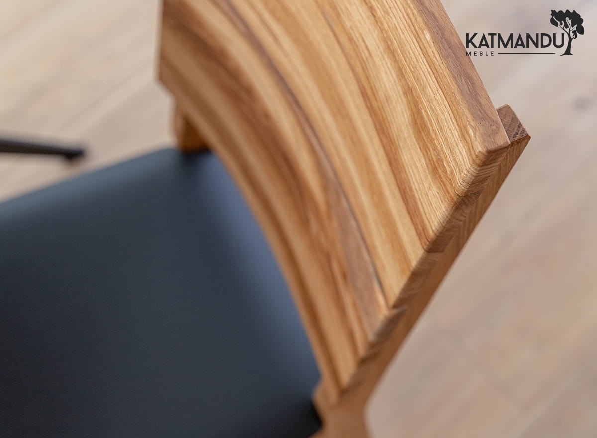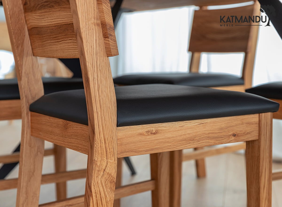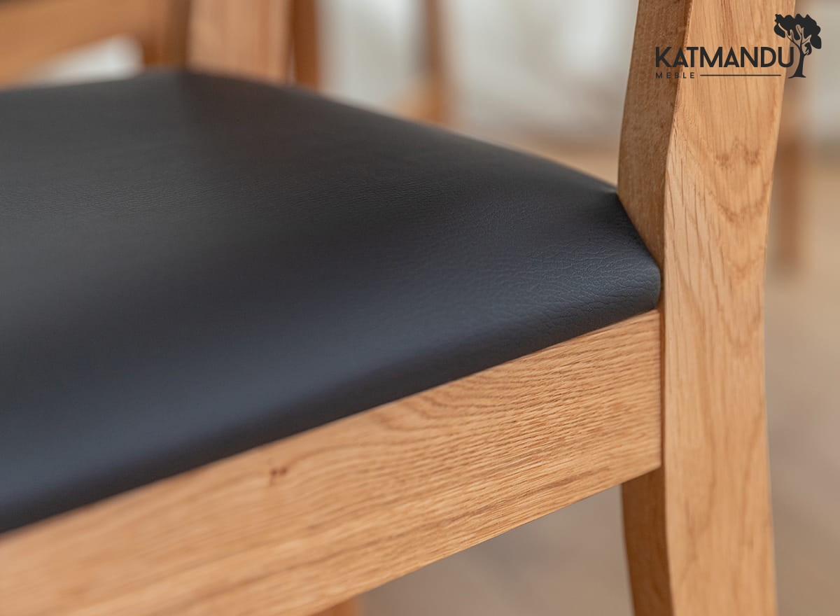 Prezentowane dębowe krzesło z czarnym siedziskiem jest lekkie wizualnie ze względu na prostą konstrukcję, co sprawia, że jest łatwe w aranżacji. Ciepła kolorystyka (odcień zależy od ustawień monitora) dobrze wpisuje się do wnętrz, w których dominuje przytulna atmosfera. Widoczne słoje i sęki na strukturze drewna czynią mebel wyjątkowym i jedynym w swoim rodzaju.
