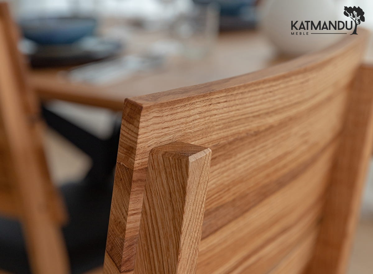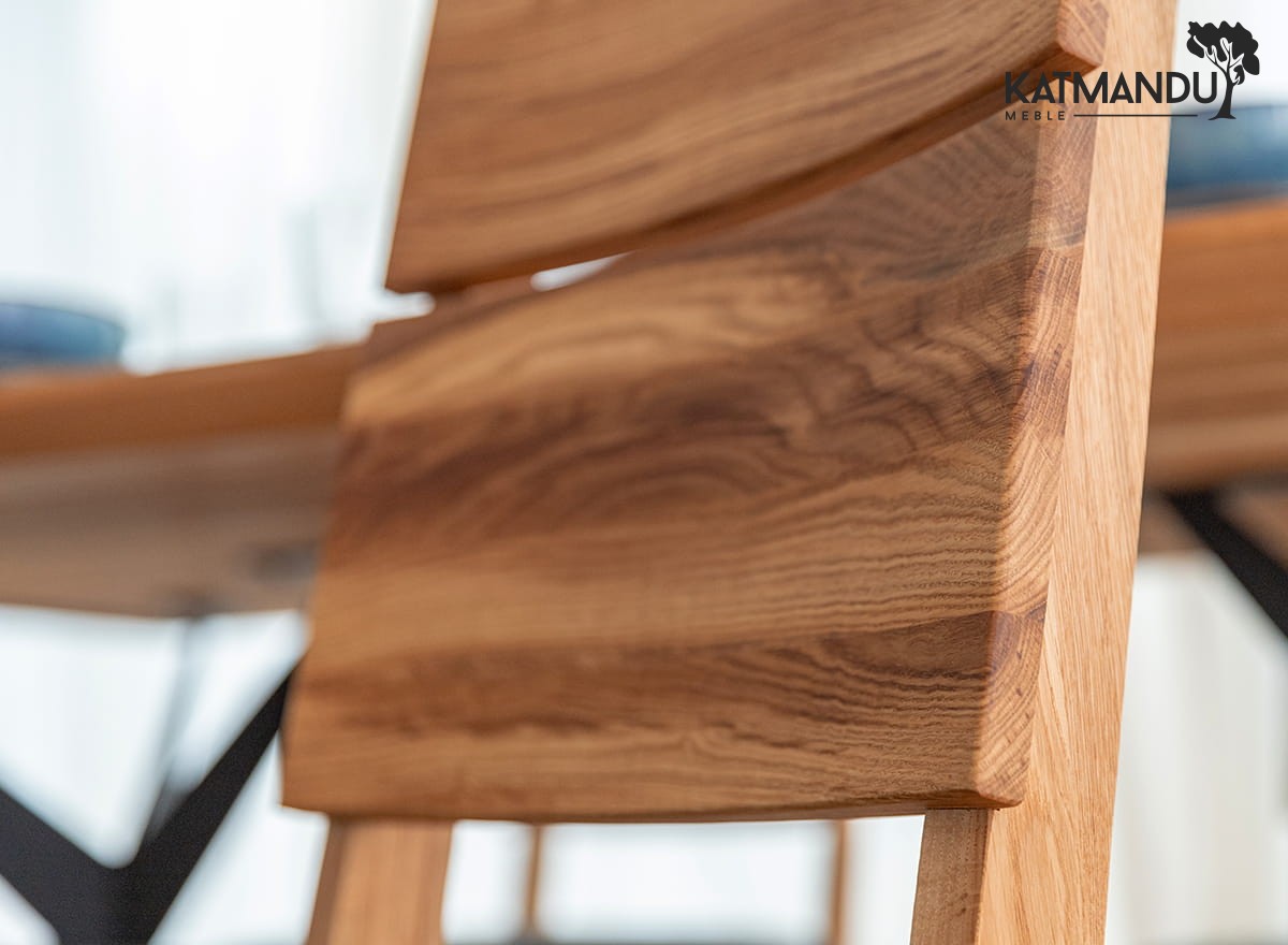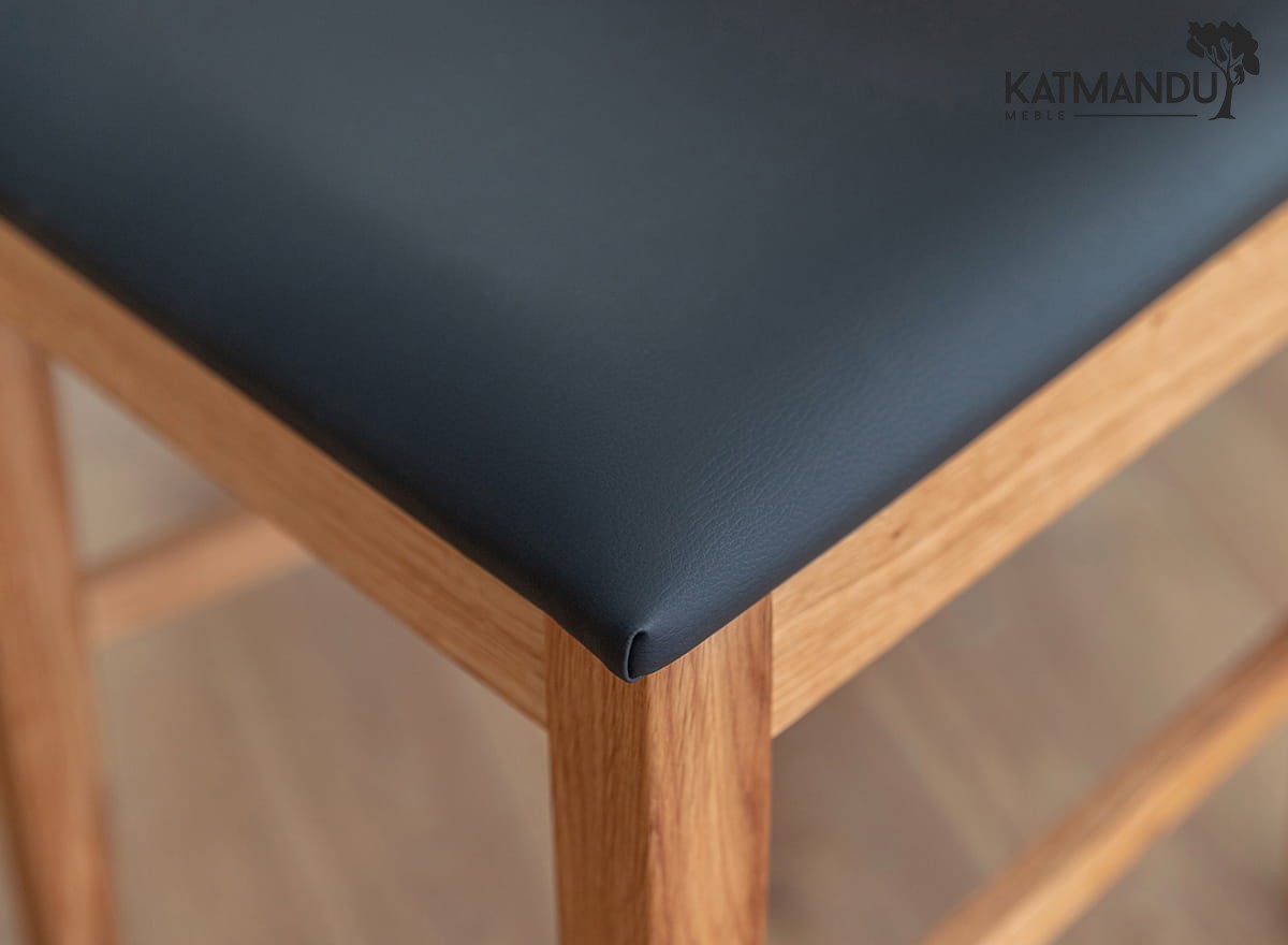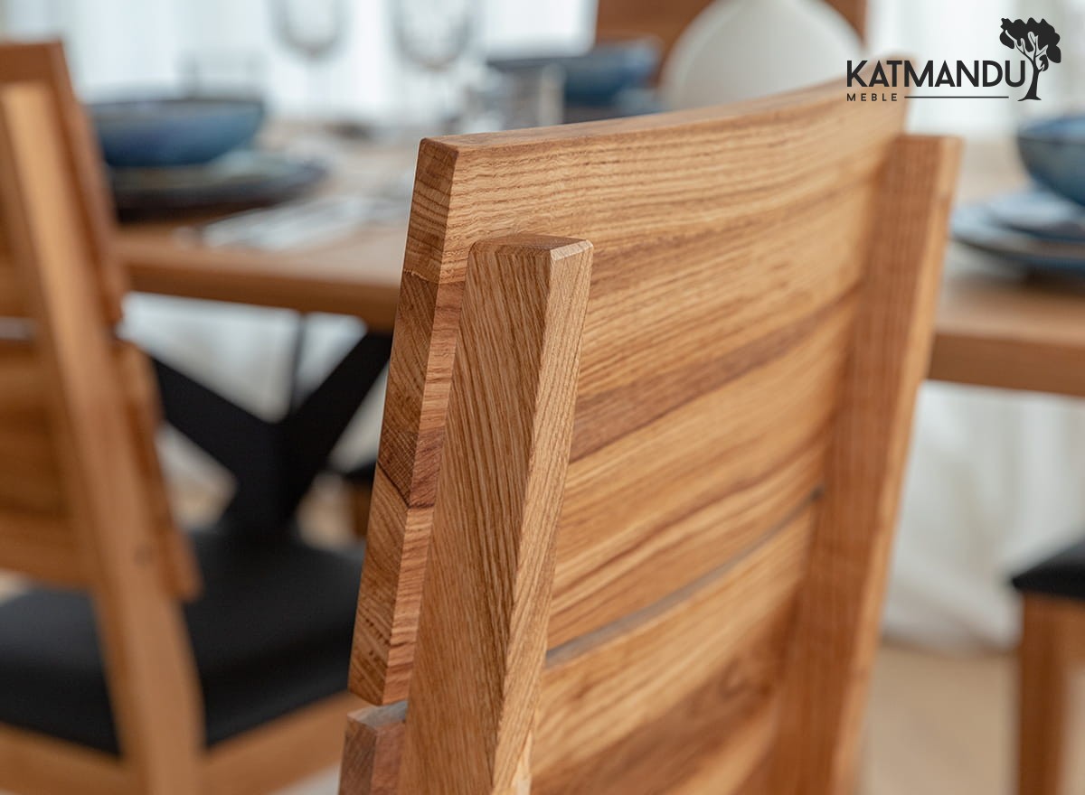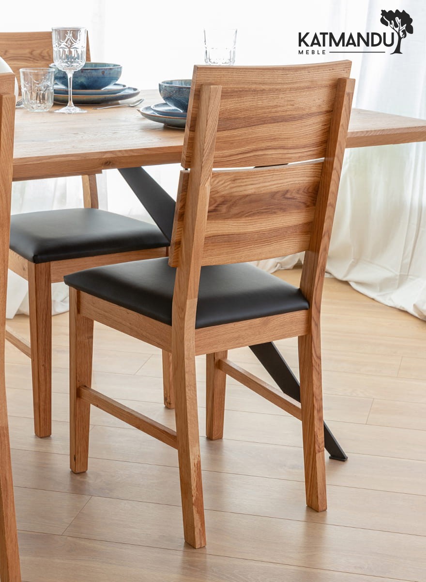 Prezentowane dębowe krzesło z czarnym siedziskiem jest lekkie wizualnie ze względu na prostą konstrukcję, co sprawia, że jest łatwe w aranżacji. Ciepła kolorystyka (odcień zależy od ustawień monitora) dobrze wpisuje się do wnętrz, w których dominuje przytulna atmosfera. Widoczne słoje i sęki na strukturze drewna czynią mebel wyjątkowym i jedynym w swoim rodzaju.
