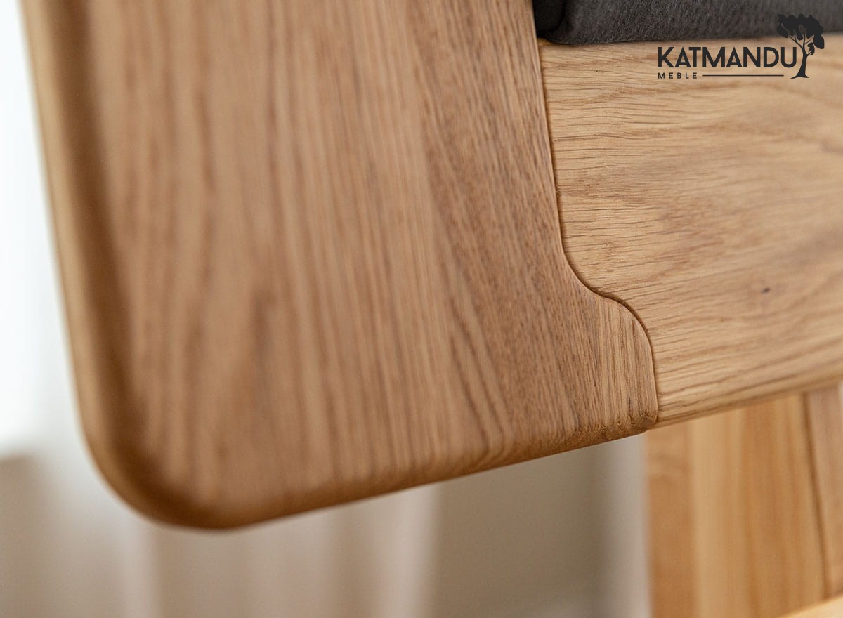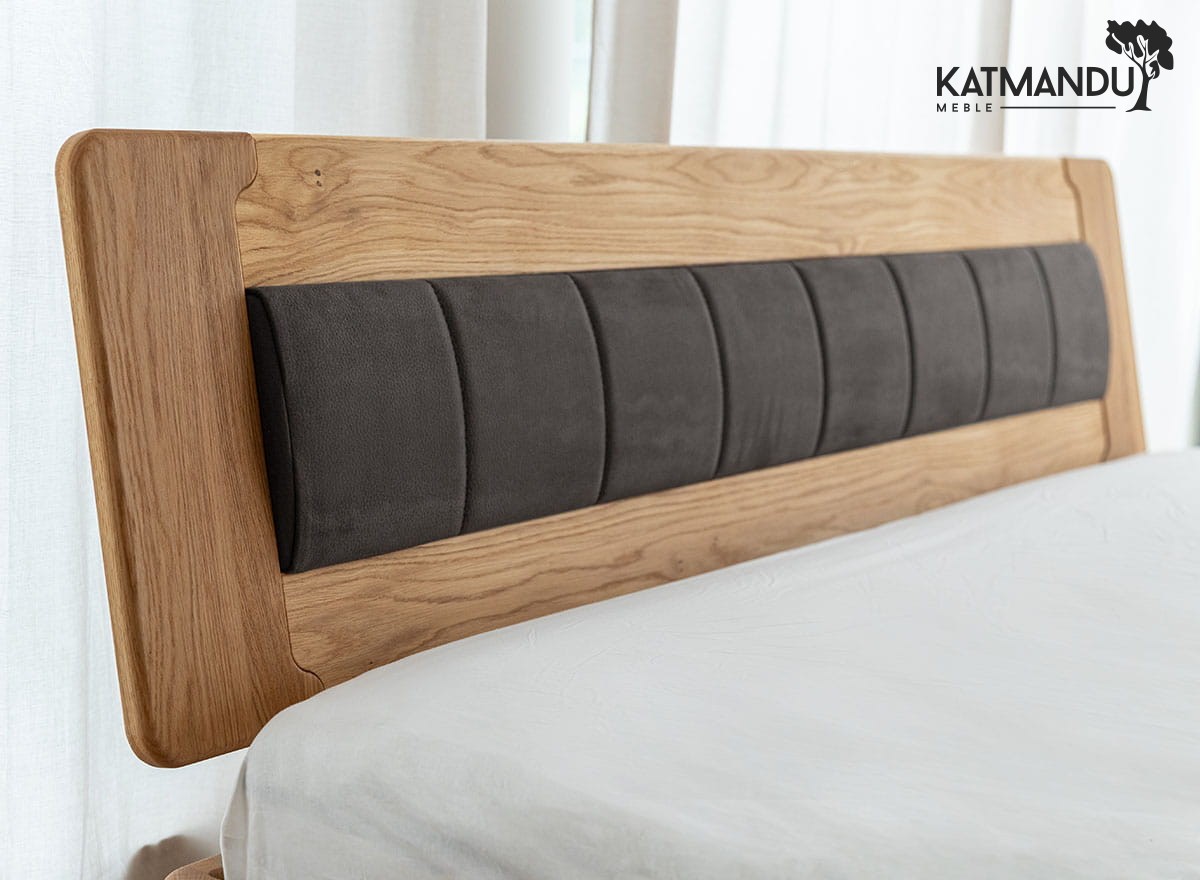 Livo zostało wykonane w całości z litego drewna dębowego – szlachetnego materiału o wyjątkowej trwałości i odporności na upływ czasu. I nie został on wybrany przypadkowo; dąb wykazuje wysoką twardość, odporność na zużycie i stabilność wymiarów, co czyni z niego surowiec dosłownie idealny na meble użytkowane codziennie. Drewno zostało w dodatku wykończone naturalnym olejem Hesse. Specyfik ten nie tylko zabezpiecza powierzchnię; on także uwydatnia jego niepowtarzalne rysunki słojów i subtelne różnice w barwie pomiędzy każdym elementem. W dodatku każdy egzemplarz łóżka to unikat – z własnym układem linii, odcieni, usłojenia. Z tyłu znajduje się zintegrowany zagłówek, w którego centrum widzimy tapicerowany, miękki wkład w odcieniu grafitowym – praktyczny i estetyczny, który wprowadzi do wnętrza dodatkowy komfort użytkowania.