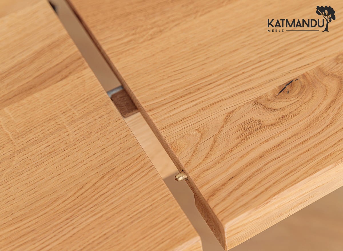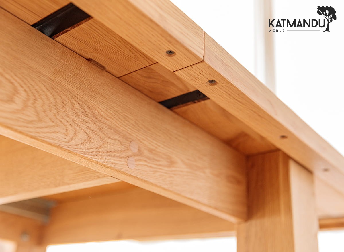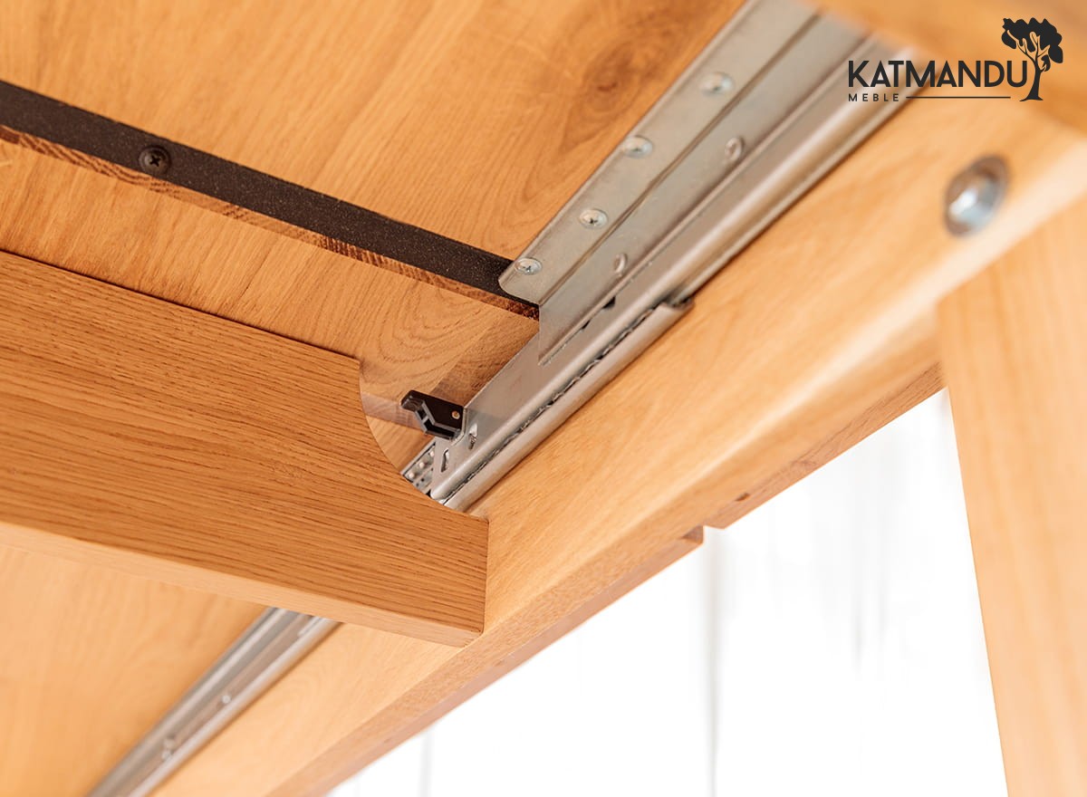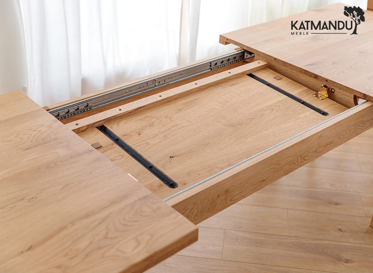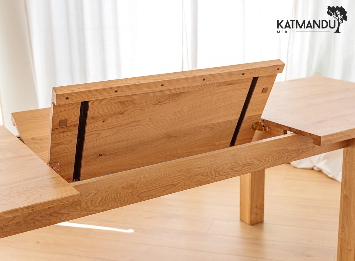 Prezentowany stół biesiadny rozsuwany opiera się na zastosowaniu systemu rozkładania „motyl”, którego największą zaletą jest z całą pewnością płynność działania oraz prostota obsługi. Składa się z dostawki o szerokości 90 cm umieszczonej pod blatem. Mebel został wykonany w całości z drewna, mianowicie dębu olejowanego, które jest w pełni zabezpieczone przed standardowymi uszkodzeniami wynikającymi z codziennej, intensywnej eksploatacji.