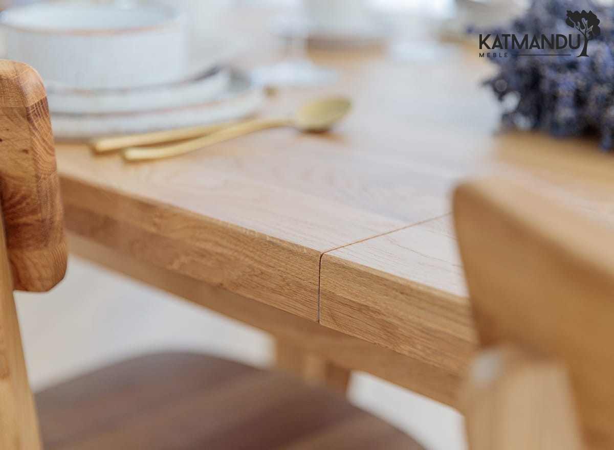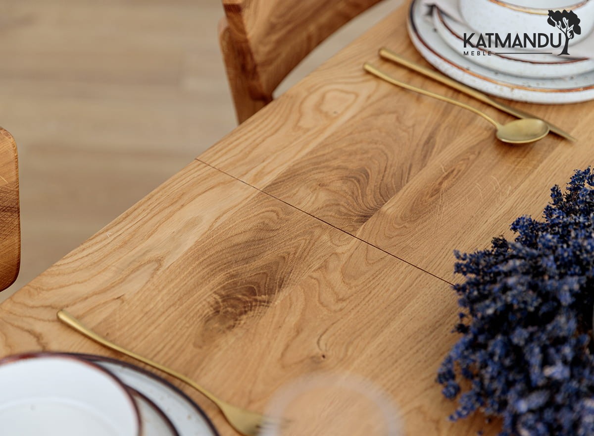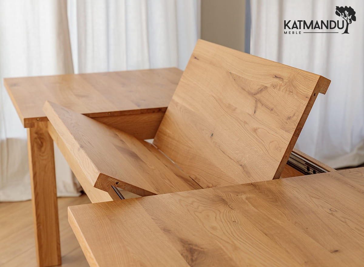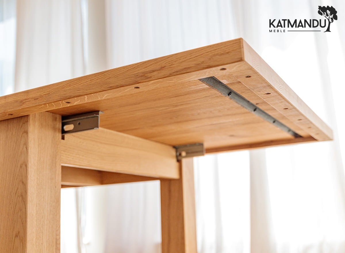 Prezentowany stół biesiadny rozsuwany opiera się na zastosowaniu systemu rozkładania „motyl”, którego największą zaletą jest z całą pewnością płynność działania oraz prostota obsługi. Składa się z dostawki o szerokości 90 cm umieszczonej pod blatem. Mebel został wykonany w całości z drewna, mianowicie dębu olejowanego, które jest w pełni zabezpieczone przed standardowymi uszkodzeniami wynikającymi z codziennej, intensywnej eksploatacji.