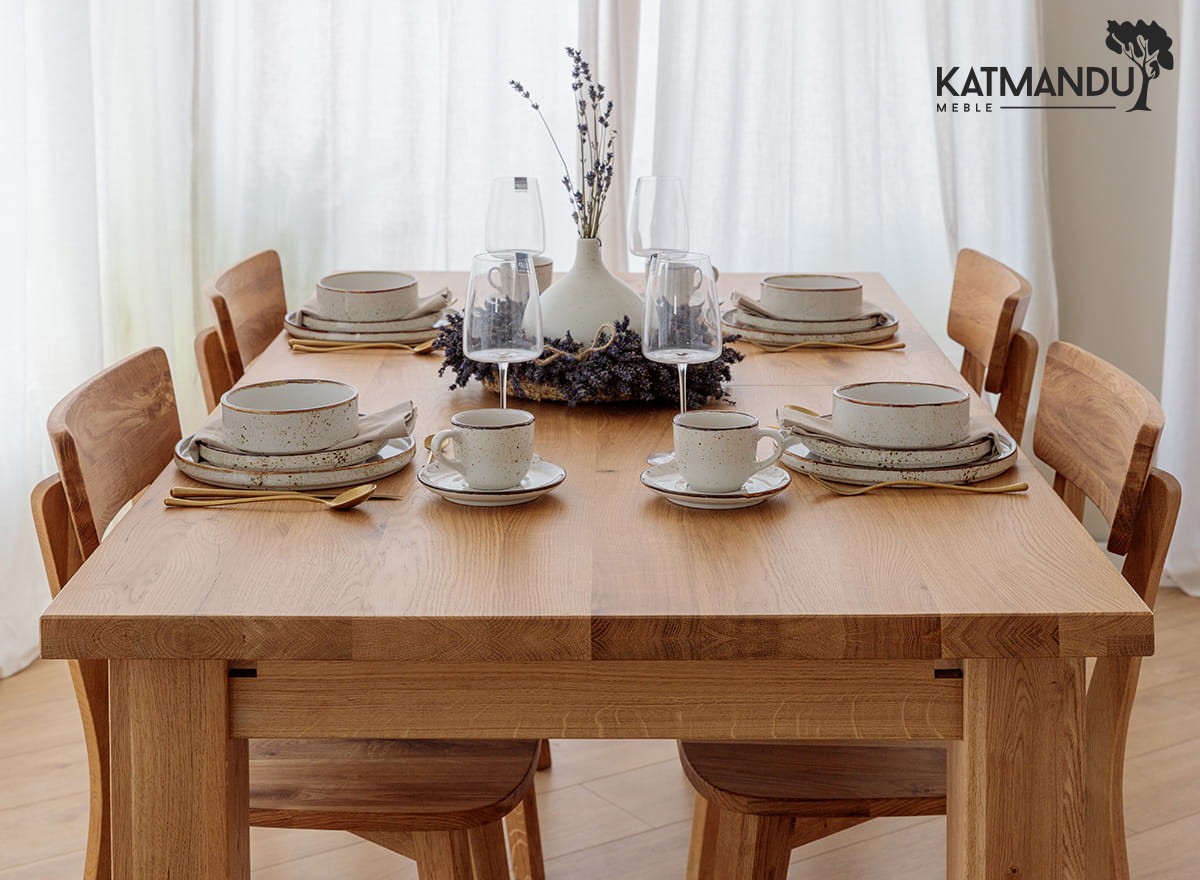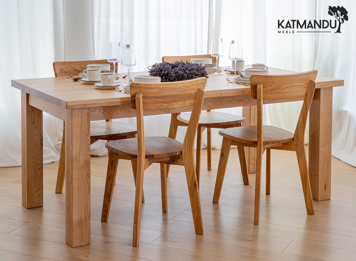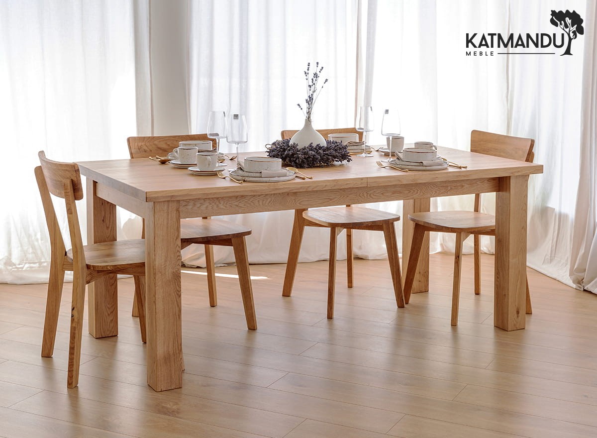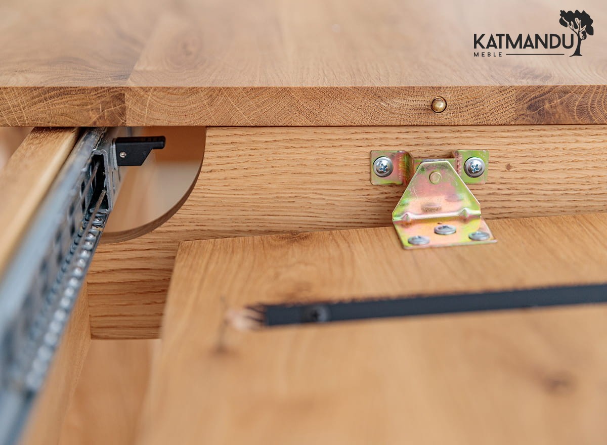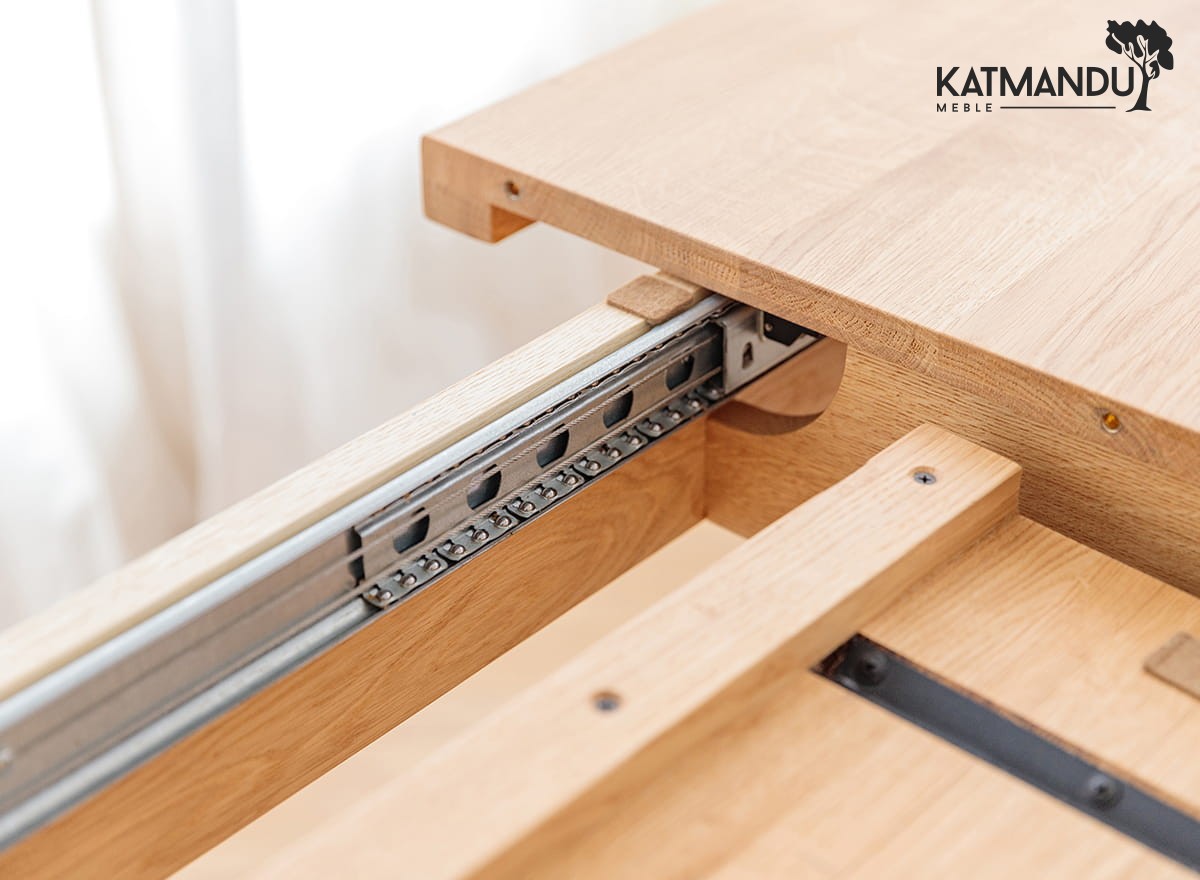 Prezentowany stół biesiadny rozsuwany opiera się na zastosowaniu systemu rozkładania „motyl”, którego największą zaletą jest z całą pewnością płynność działania oraz prostota obsługi. Składa się z dostawki o szerokości 90 cm umieszczonej pod blatem. Mebel został wykonany w całości z drewna, mianowicie dębu olejowanego, które jest w pełni zabezpieczone przed standardowymi uszkodzeniami wynikającymi z codziennej, intensywnej eksploatacji.