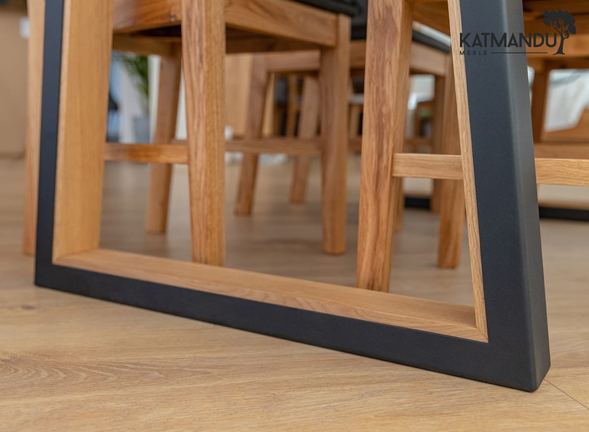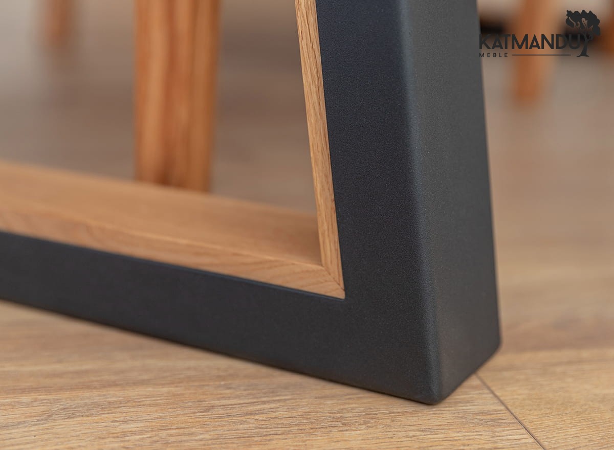 Prezentowany stół dębowy na metalowych nogach estetycznie łączy naturalny, ciepły kolor drewna z ponadczasową czernią (odcienie mogą się różnić, gdyż wszystko zależy od parametrów ekranu/monitora). Duży blat zapewnia wygodę i komfort siedzenia przy stole kilku osobom i pomaga stworzyć rodzinną atmosferę podczas spotkań w większym gronie.