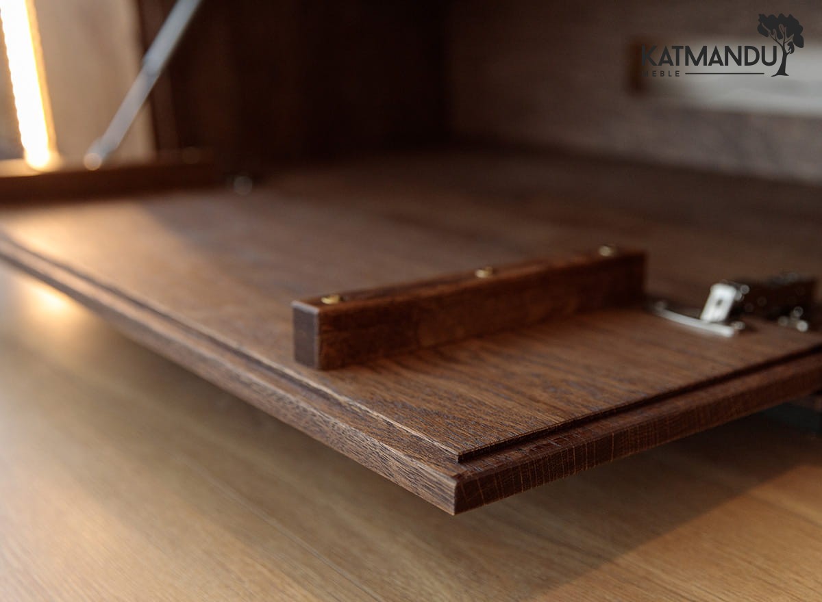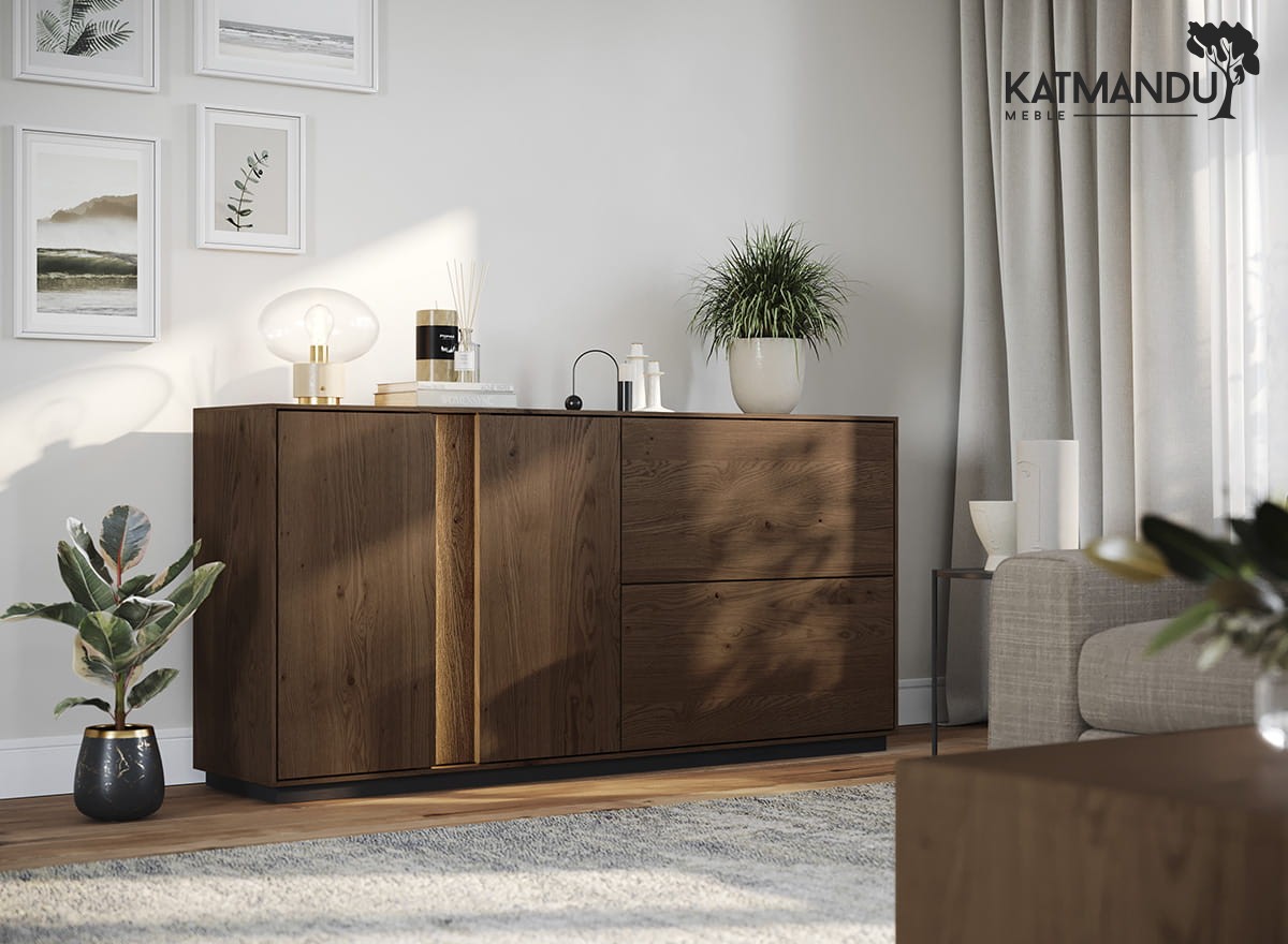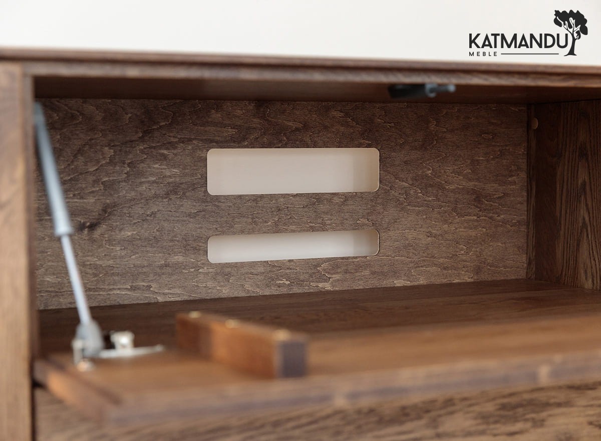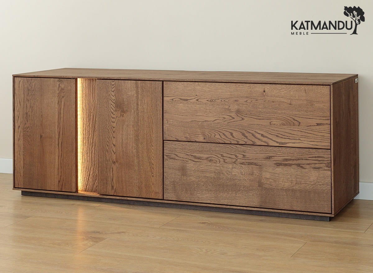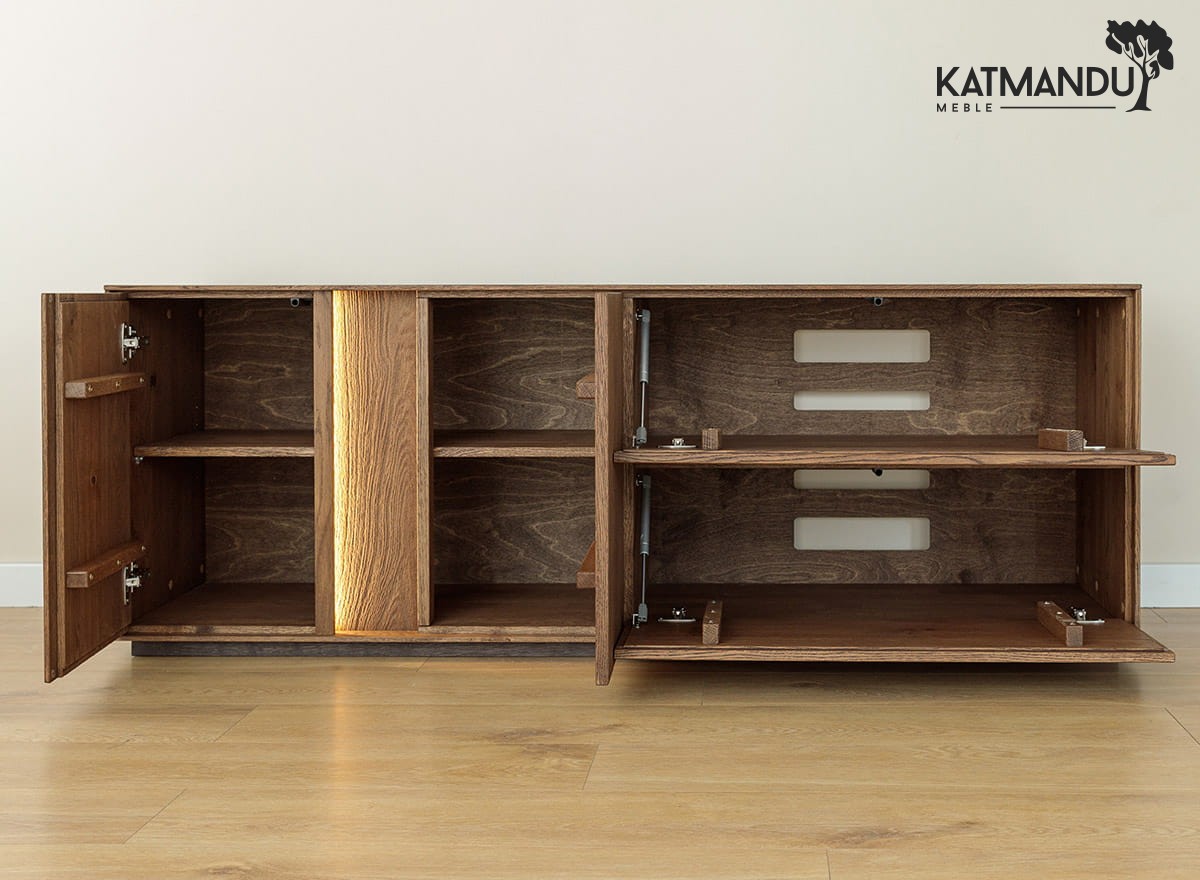 Przestrzeń wewnątrz dębowej szafki RTV? Przemyślana w każdym calu. Pojemne szafki i szuflady pomieszczą kable, piloty, płyty i wszystkie te drobiazgi, które zwykle wprowadzają chaos. Wbudowane oświetlenie LED subtelnie podkreśla linię mebla, tworząc nastrojowe tło, szczególnie wieczorem. To nie tylko szafka pod telewizor – to centrum domowej rozrywki, które działa równie dobrze, jak wygląda.