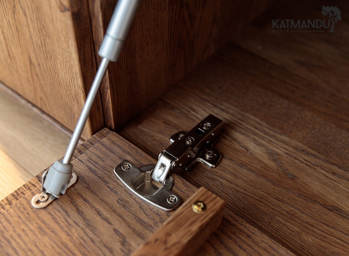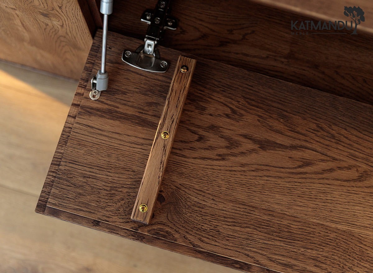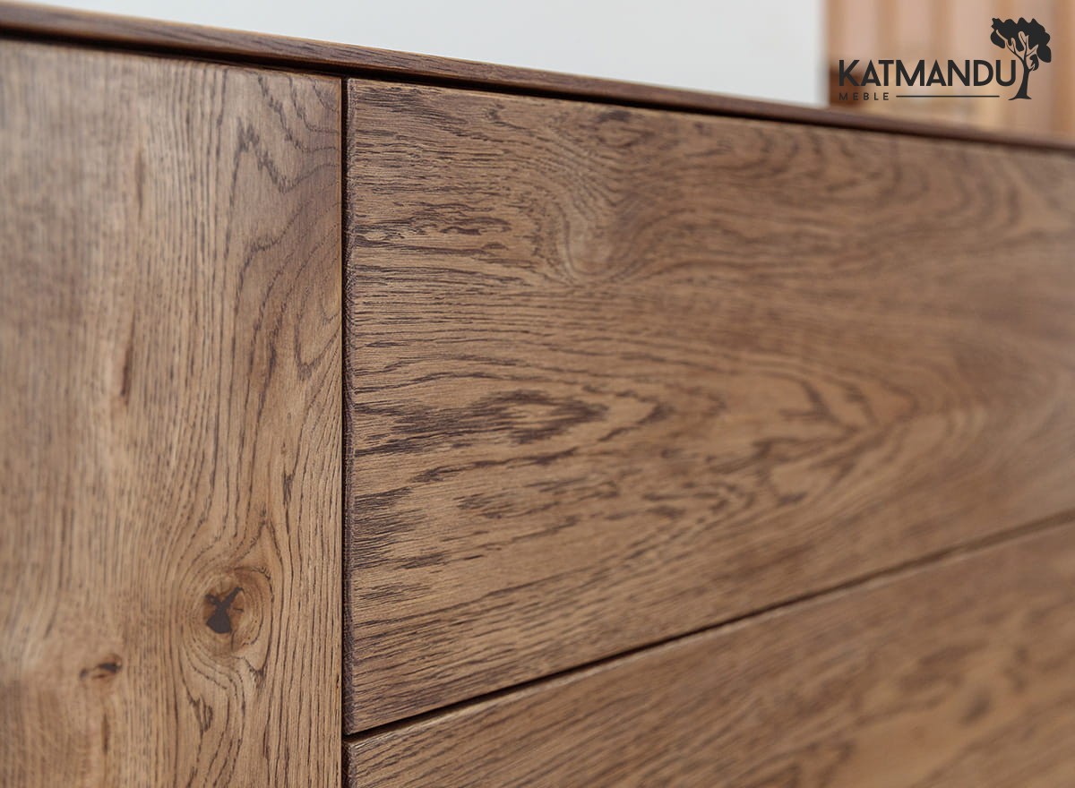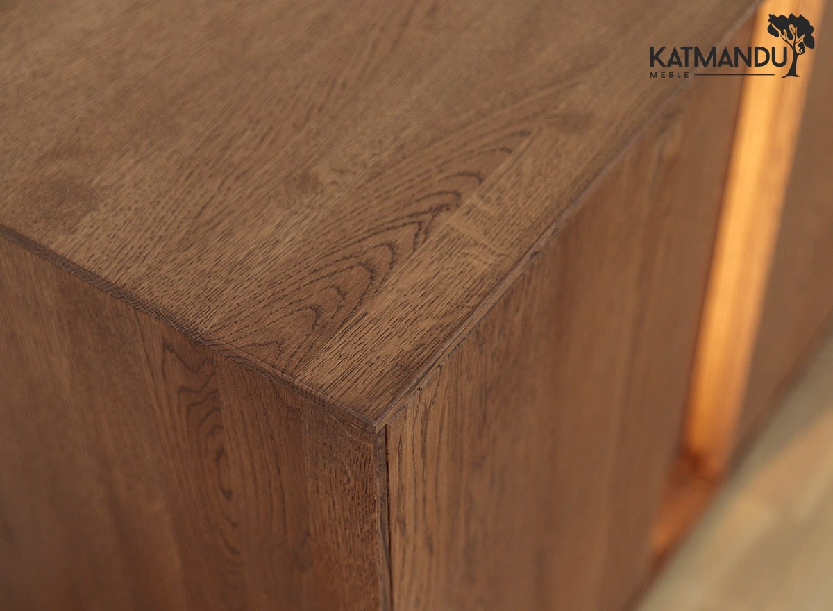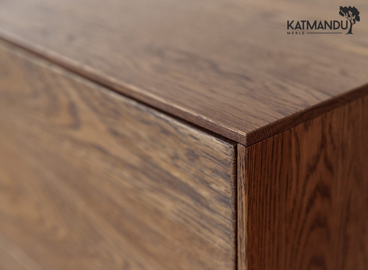 Drewno dębowe to gwarancja trwałości, ale tutaj idzie to w parze z wygodą. Każdy element, od zaoblonych krawędzi po system tip-on, został zaprojektowany z myślą o codziennym użytkowaniu. Drzwi i szuflady otwierają się na lekkie dotknięcie – bez uchwytów, bez zbędnych detali. Olejowana powierzchnia nie tylko podkreśla naturalną strukturę drewna, ale także chroni je przed uszkodzeniami. Stabilna konstrukcja gwarantuje, że szafka poradzi sobie z ciężarem sprzętu i z upływem czasu. Mebel dociera do Ciebie w stanie gotowym do użytku, więc nie musisz poświęcać czasu na jego składanie – wystarczy ustawić go w wybranym miejscu i cieszyć się jego użytkowaniem.