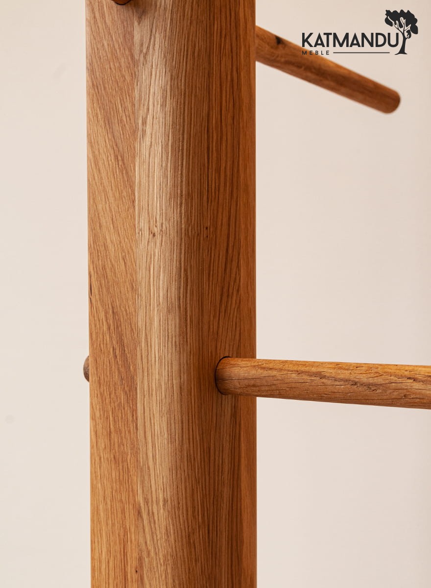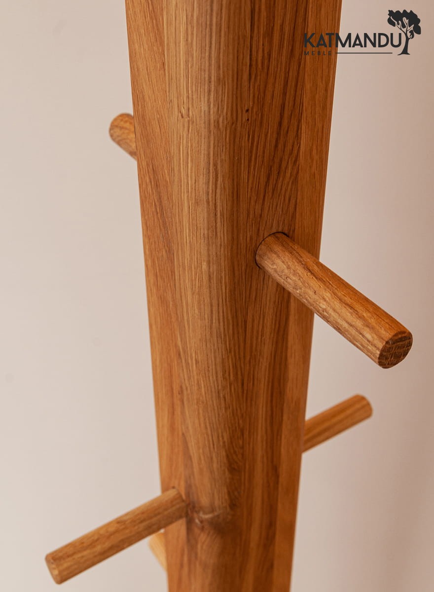Prostokątny, wysoki słupek jest naprawdę niepozorny i zarazem zachwycający. Prosta konstrukcja bazuje na smukłym korpusie z zaokrąglonymi krawędziami, przez co jest znacznie bezpieczniejszy, zwłaszcza jeżeli masz dzieci. Ale jego urok to również wybarwienie. Naturalne drewno wykończono jedynie olejem, który podbija koloryt dębu, uwydatnia naturalne usłojenie i sęki, które podkreślają niebanalny urok dębowego wieszaka do przedpokoju.