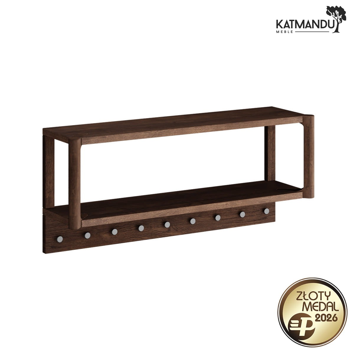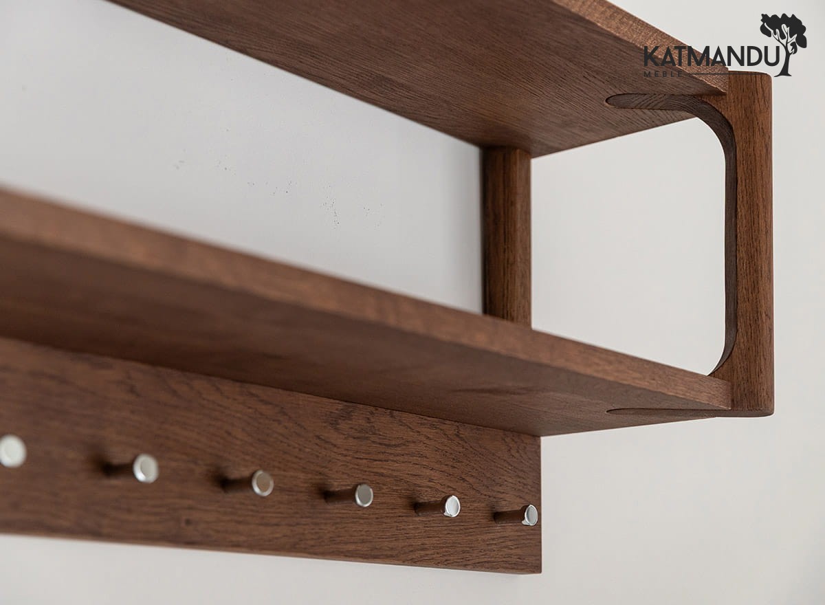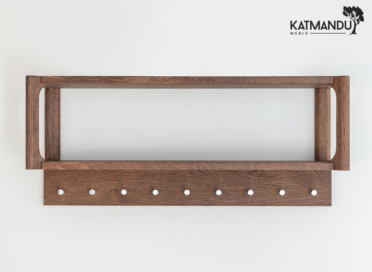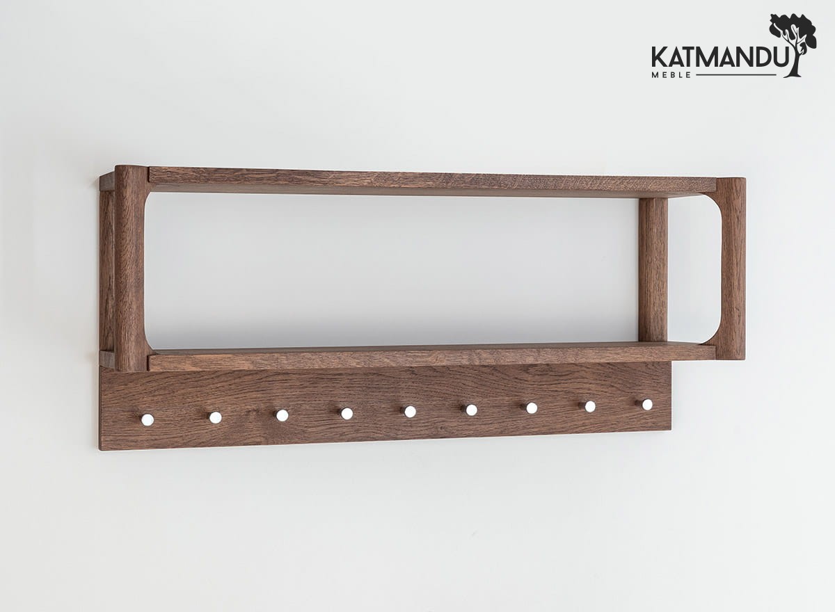 Wieszak dębowy z kolekcji Campi to nie tylko modne akcesorium domowe – to przemyślana konstrukcja z litego drewna dębowego. Dobrze dociążony, zabezpieczony olejem Borma, odporny na zarysowania i intensywne użytkowanie. Dziesięć kołków rozmieszczonych w równych odstępach pozwala zawiesić naprawdę wiele – kurtki, torby, dziecięce plecaki, szale, a nawet mokre parasole. Górna półka staje się dodatkową strefą organizacji: tu coś odłożysz, tam postawisz dekorację, a może po prostu – książkę lub kask. I to wszystko bez wrażenia przytłoczenia.