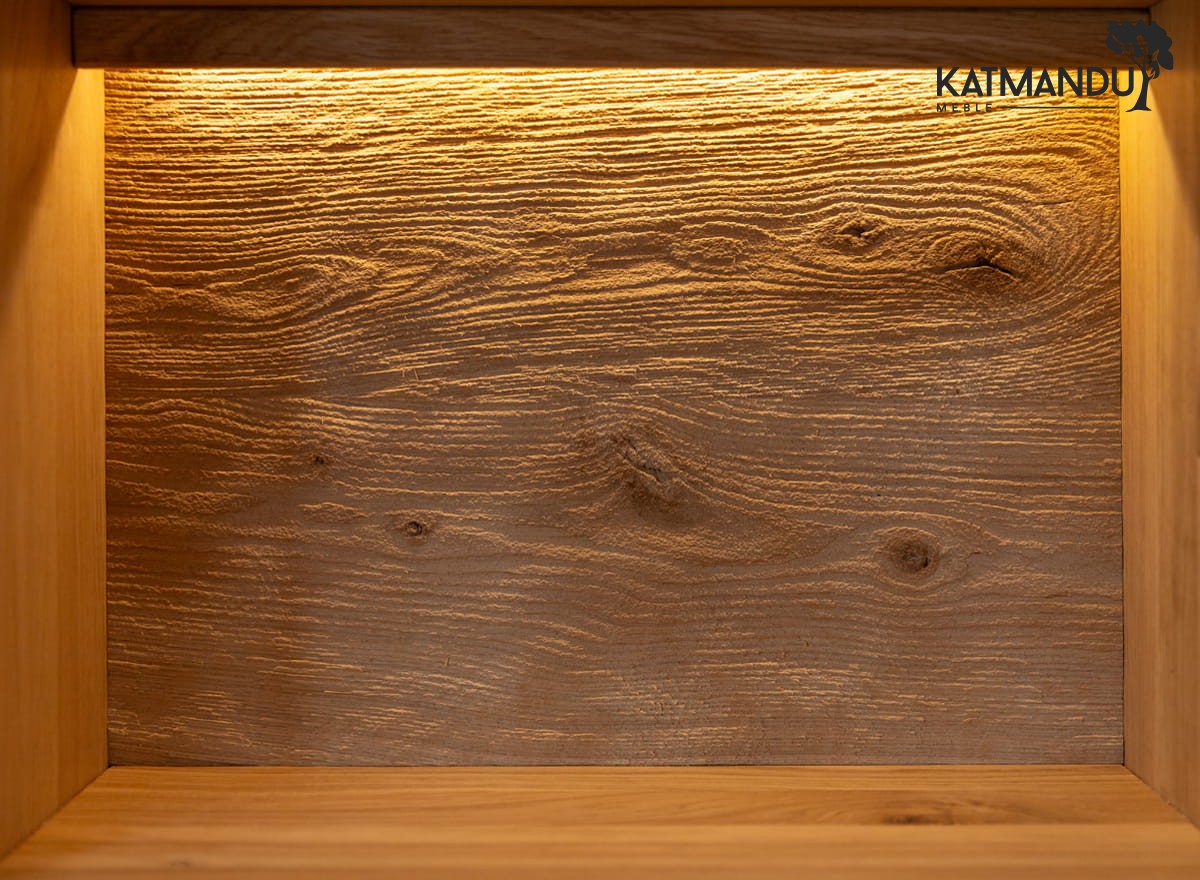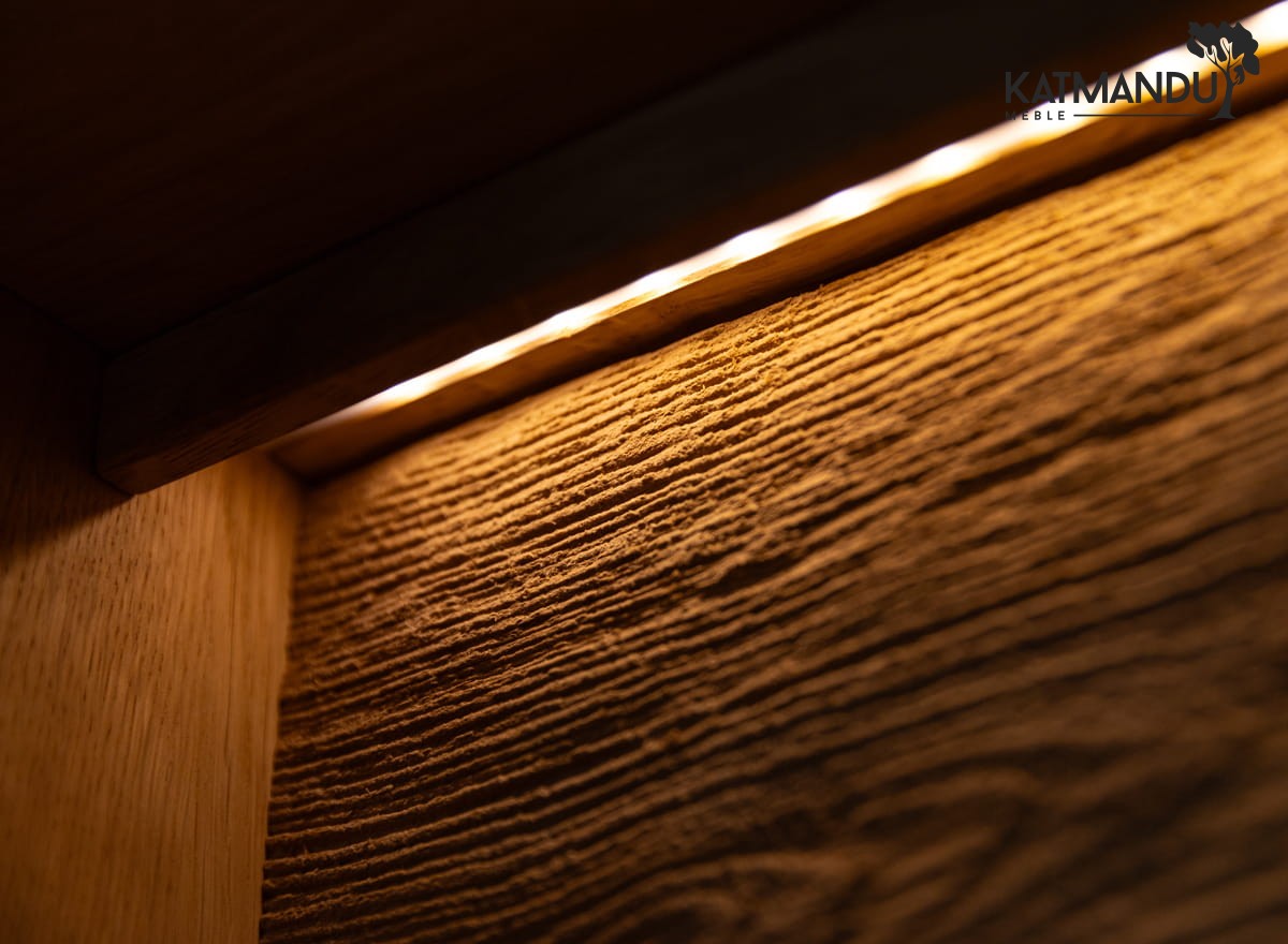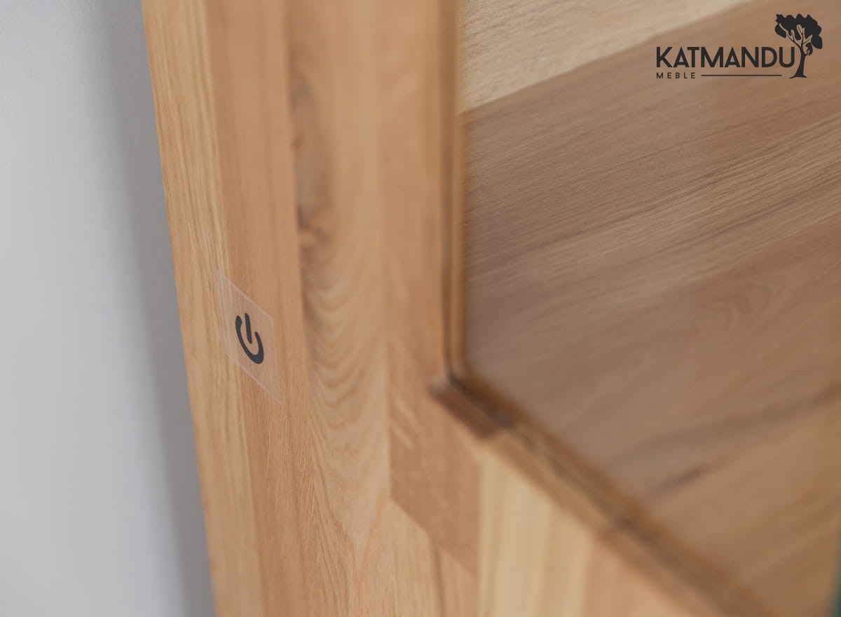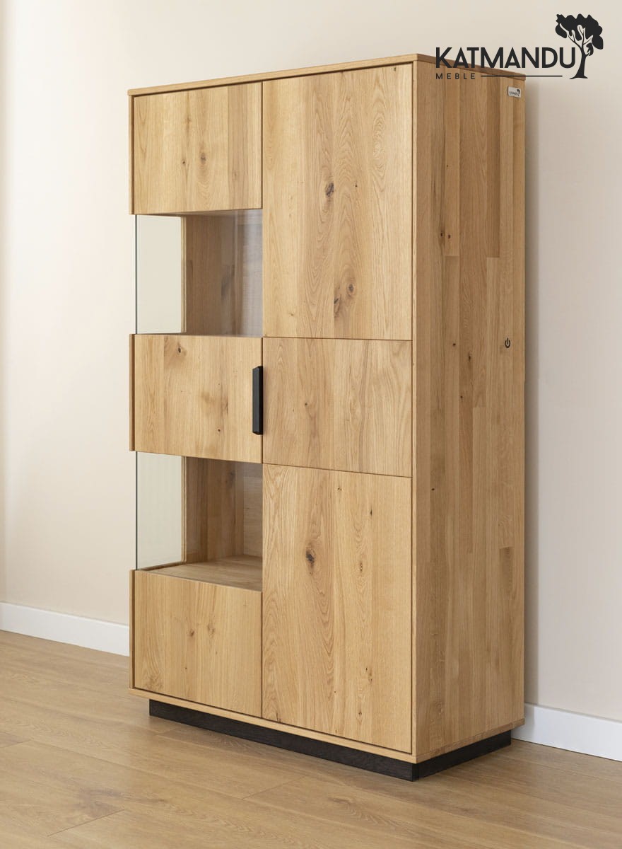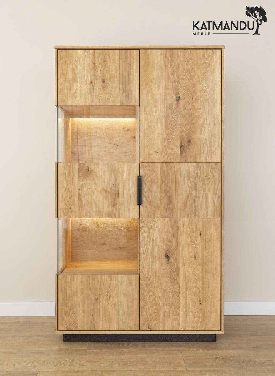 Witryna dębowa łączy w sobie funkcję praktycznego mebla z elementem wyposażenia wnętrz, który z łatwością stanie się domowym centrum kultury. Idealnie pasuje do roli eleganckiej biblioteczki, w której można zarówno przechowywać ulubione powieści, jak i wystawić na pokaz cenne pamiątki. Zwiększona ilość półek pozwala na segmentację zbiorów tematycznych, jednocześnie zachowując ich estetyczną prezentację. Tuż za szklanymi frontami widoczne są elementy z eleganckim szczotkowaniem. Włącznik dotykowy, umieszczony wewnątrz i oznaczony charakterystyczną ikoną żarówki, za jednym dotknięciem podświetla witrynę, jednocześnie podkreślając piękno naturalnego drewna.