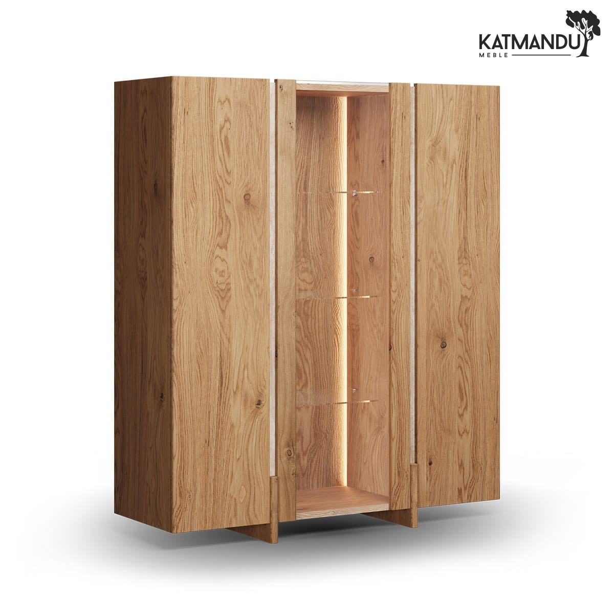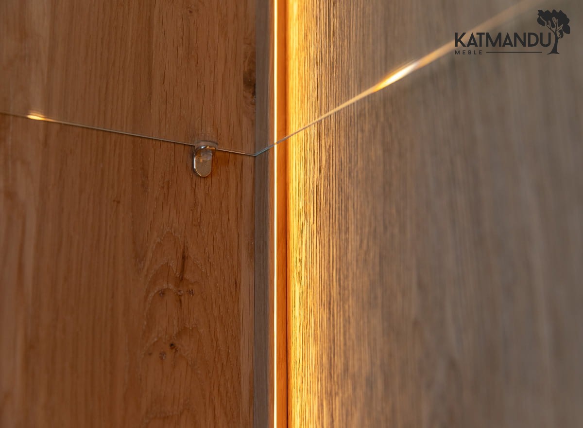 Niska witryna drewniana z kolekcji Tivoli w wybarwieniu dąb naturalny to mebel, w którym ciepło litego drewna i transparentność szkła tworzą przestrzeń ekspozycyjną o wyjątkowo przytulnym, a zarazem luksusowym nastroju. Nasycony ton naturalnego dębu otula majestatyczną bryłę ciepłem, które natychmiast zmienia atmosferę salonu, a przeszklone drzwi odsłaniają wnętrze z dziewięcioma półkami – galeryjną scenografię dla osobistych zbiorów. Wąskie wstawki z naturalnego trawertynu między segmentami drzwi wprowadzają mineralny kontrapunkt do gładkości drewna – surowa, porowata faktura kamienia w połączeniu z organicznym ciepłem dębu, tworzy duet materiałów, który jest istotą kolekcji Tivoli. Ciepłe podświetlenie LED wchodzące w skład zestawu otula eksponowane przedmioty złocistą poświatą, idealnie zharmonizowaną z tonacją drewna.
