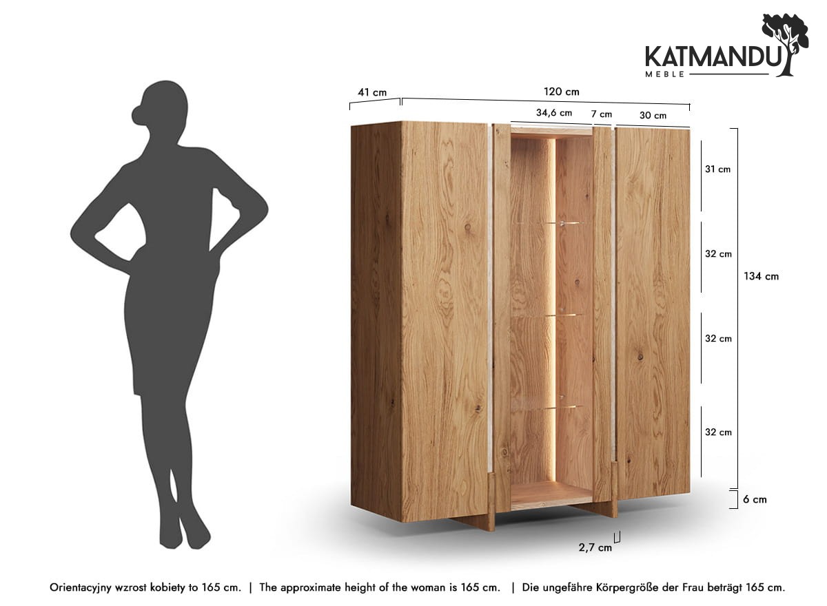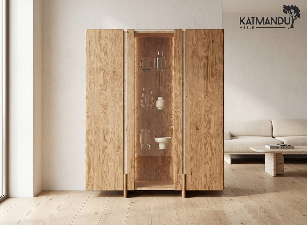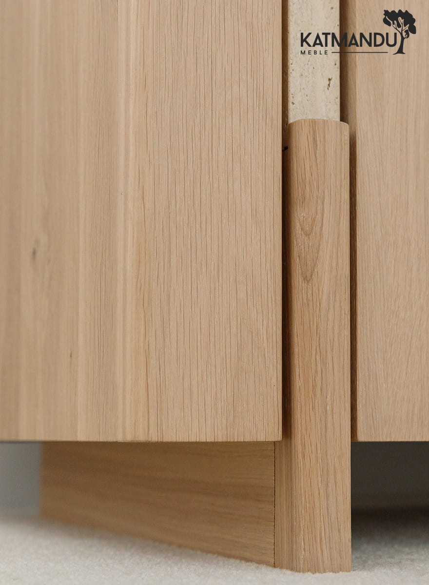 Lite drewno dębowe olejowane olejem naturalnym stanowi trzon tej witryny drewnianej – powierzchnia jest matowa, żywa i ciepła w dotyku, a rysunek słojów wydobyty z intensywnością, jakiej nie osiągnie żaden lakier ani bejca. Z upływem lat naturalny dąb delikatnie pogłębia swój odcień, nabierając jeszcze szlachetniejszego wyrazu – witryna z kolekcji Tivoli nie starzeje się, lecz dojrzewa. Szkło float extra białe zastosowane w drzwiach zachowuje krystaliczną przejrzystość bez przekłamań kolorystycznych, wiernie prezentując eksponowane wewnątrz przedmioty. Trawertyn osadzony w bryle z chirurgiczną precyzją jest unikatowy w każdym egzemplarzu.
