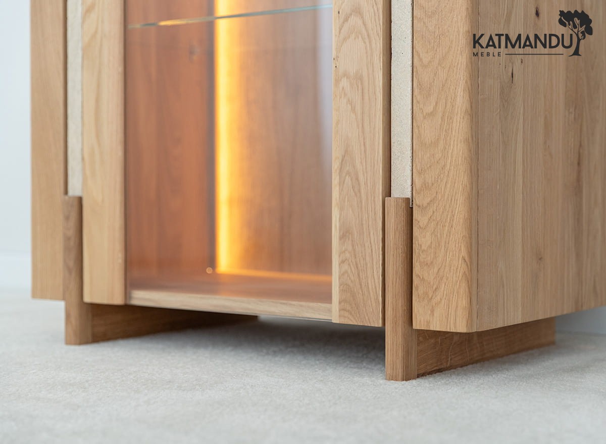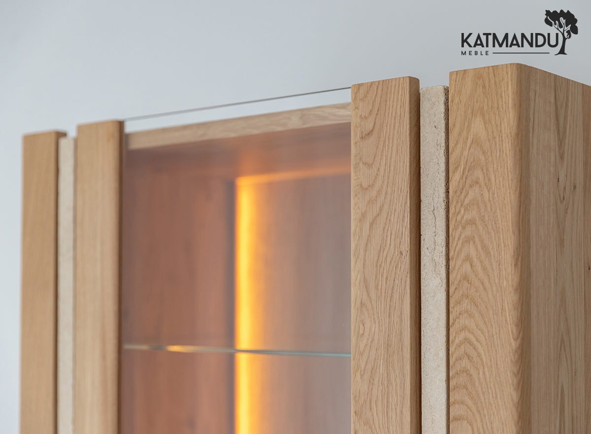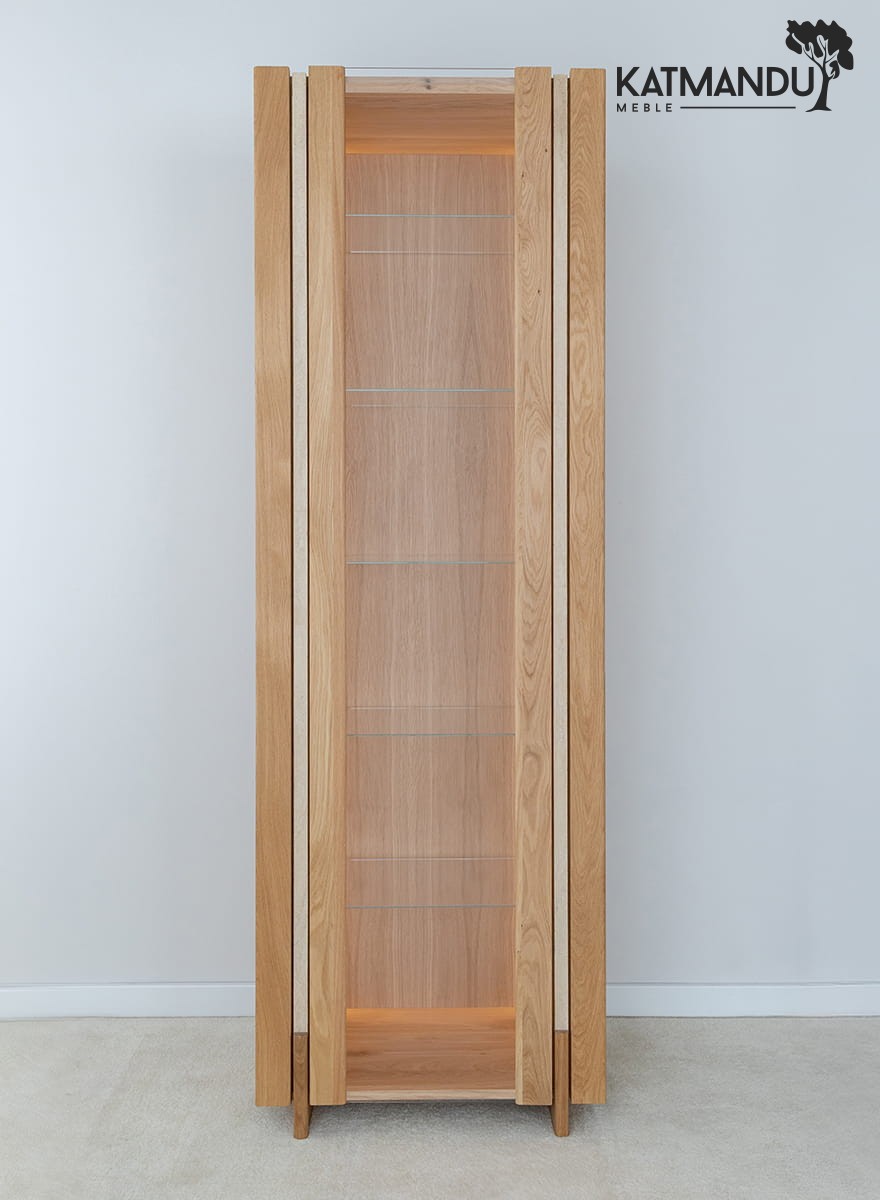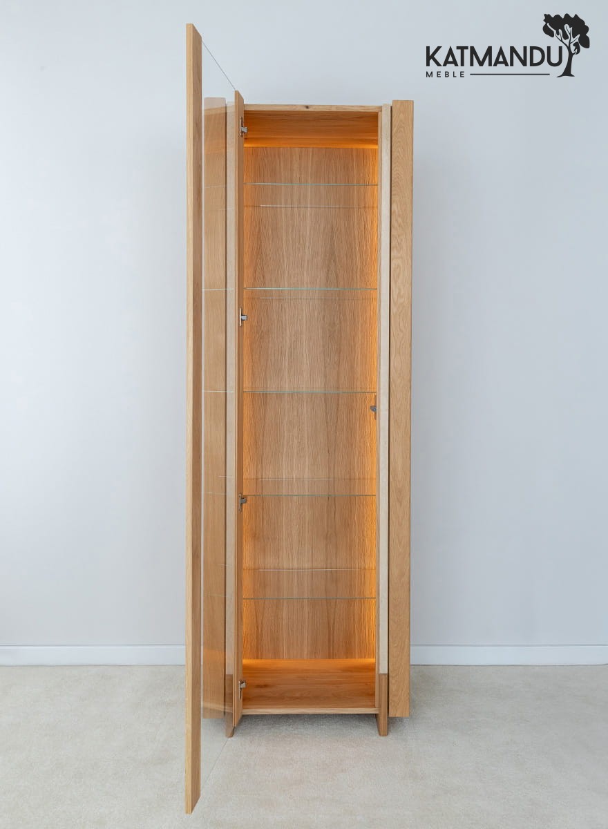 Witryna drewniana wysoka z kolekcji Tivoli w wersji dąb naturalny to mebel z pogranicza wzornictwa meblowego i architektury wnętrz. Ciepłe oświetlenie LED zamienia wnętrze witryny w świetlistą wieżę, która po zmroku staje się najbardziej wyrazistym elementem pomieszczenia. Drewniana witryna z trawertynem z kolekcji Tivoli to obiekt zaprojektowany dla tych, którzy rozumieją, że prawdziwy prestiż wyrażany jest przez jakość materiału i powściągliwość formy – nigdy przez nadmiar.