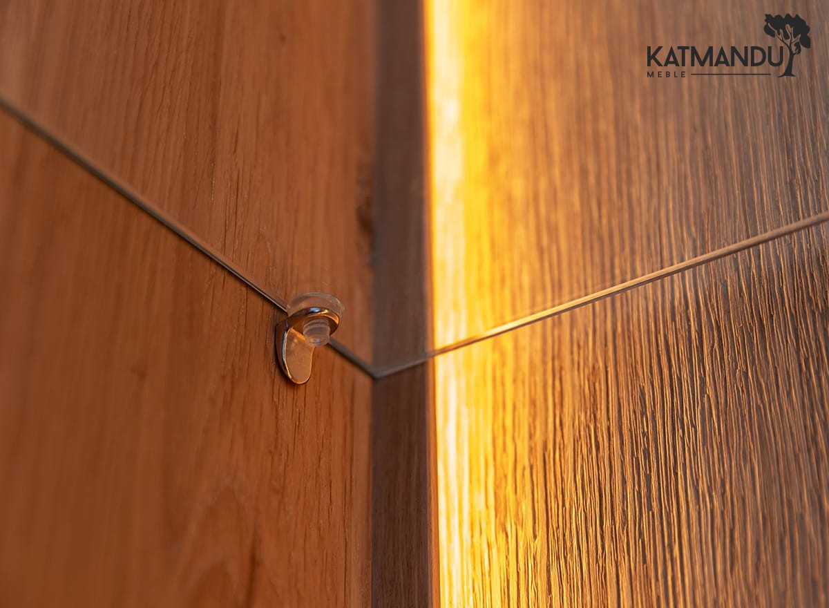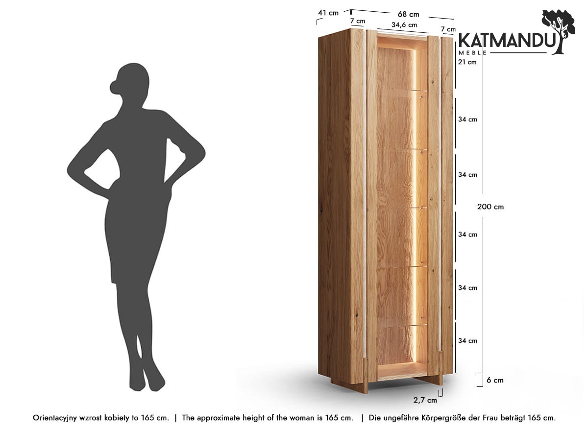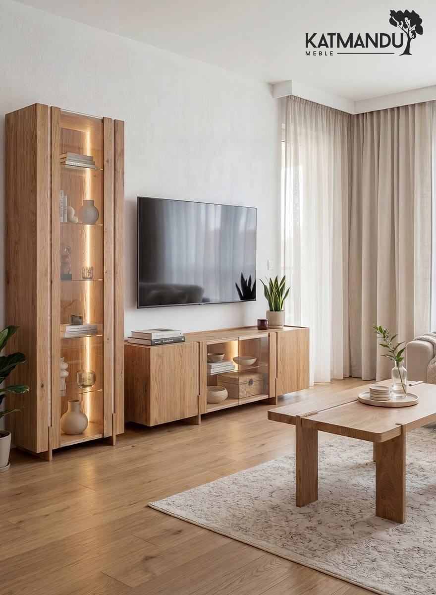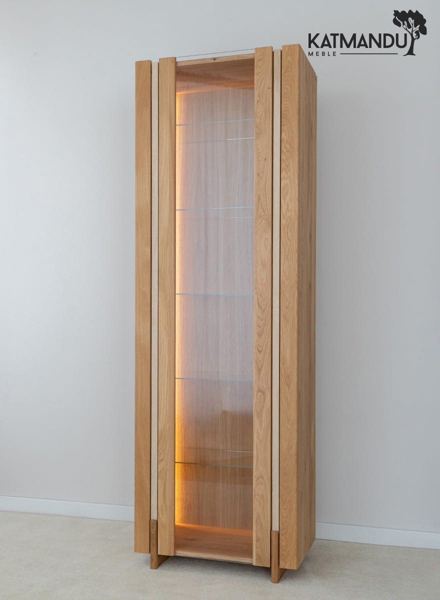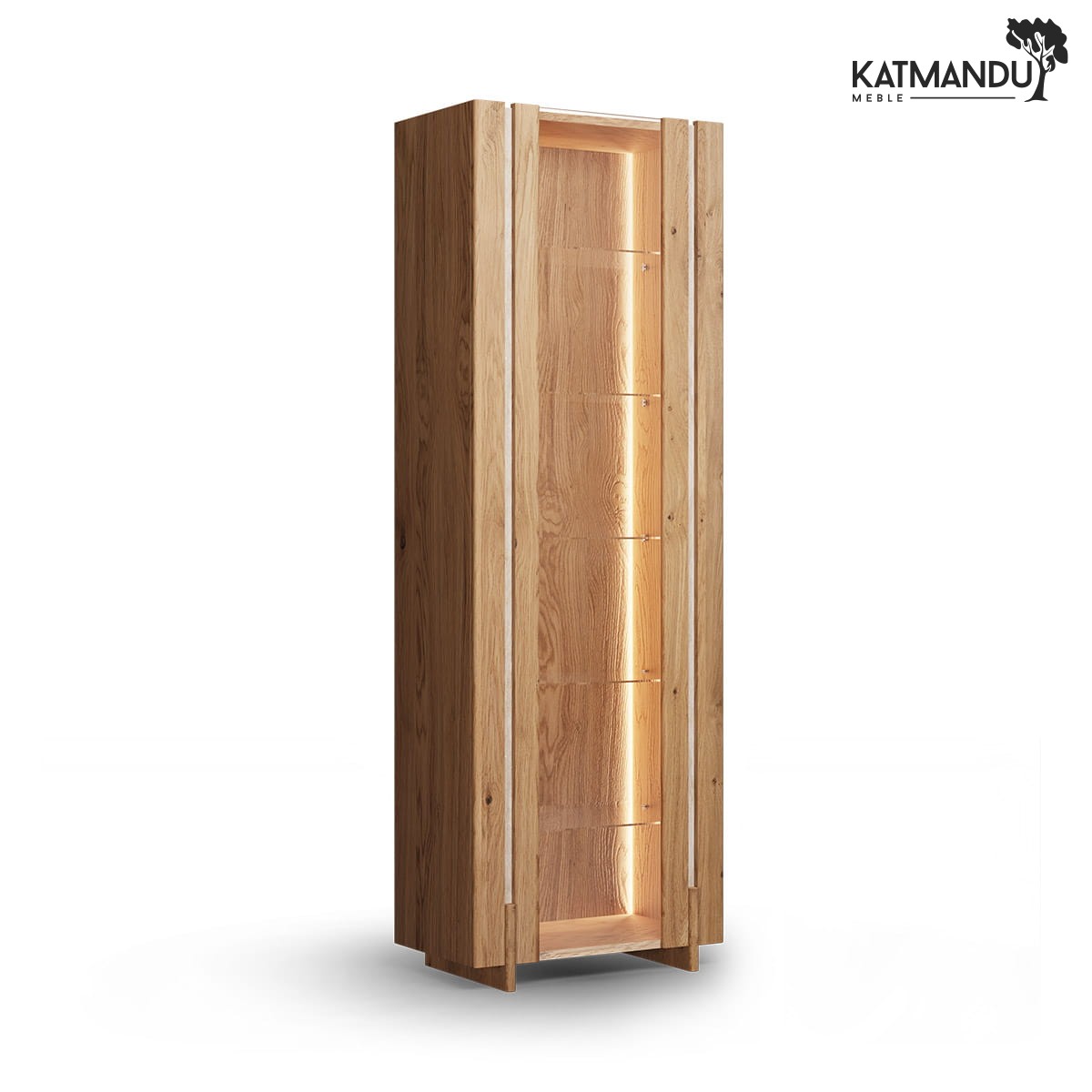Witryna drewniana wysoka z kolekcji Tivoli w wersji dąb naturalny to mebel z pogranicza wzornictwa meblowego i architektury wnętrz. Ciepłe oświetlenie LED zamienia wnętrze witryny w świetlistą wieżę, która po zmroku staje się najbardziej wyrazistym elementem pomieszczenia. Drewniana witryna z trawertynem z kolekcji Tivoli to obiekt zaprojektowany dla tych, którzy rozumieją, że prawdziwy prestiż wyrażany jest przez jakość materiału i powściągliwość formy – nigdy przez nadmiar.