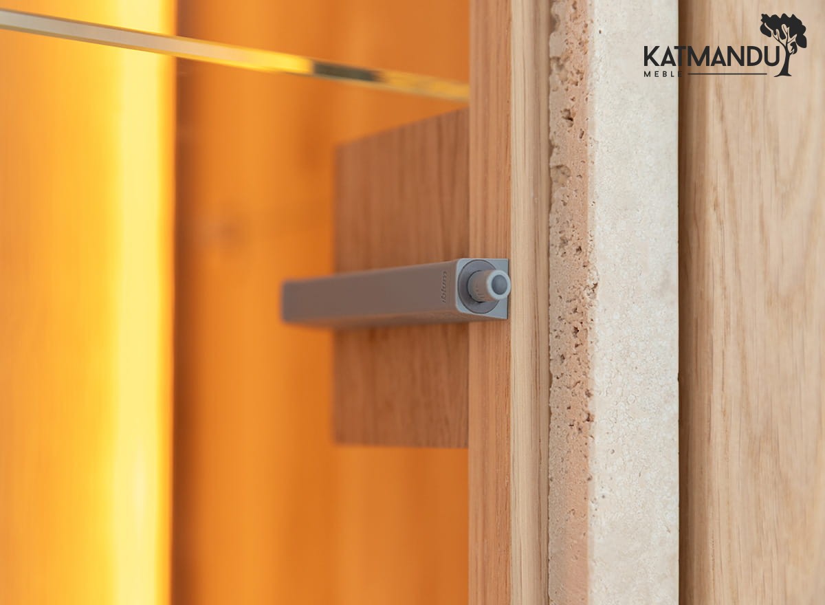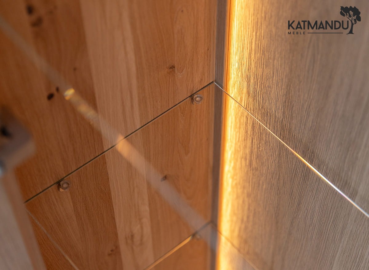 Olejowanie naturalnie wydobywa z litego dębu rysunek słojów z głębią nieosiągalną dla lakieru, a jednocześnie chroni drewno bez blokowania jego zdolności do oddychania. Z upływem lat naturalny dąb subtelnie ciemnieje, co podkreśla jego szlachetność. Szkło zachowuje perfekcyjną przejrzystość, a trawertyn – kamień zajmujący ważne miejsce w architekturze – wnosi do kompozycji geologiczną autentyczność, której nie zastąpi żadna ceramika ani konglomerat. Precyzja osadzenia kamienia w drewnie, gładkość olejowanej powierzchni i równomierny ruch drzwi potwierdzają bezkompromisowy standard produkcji.