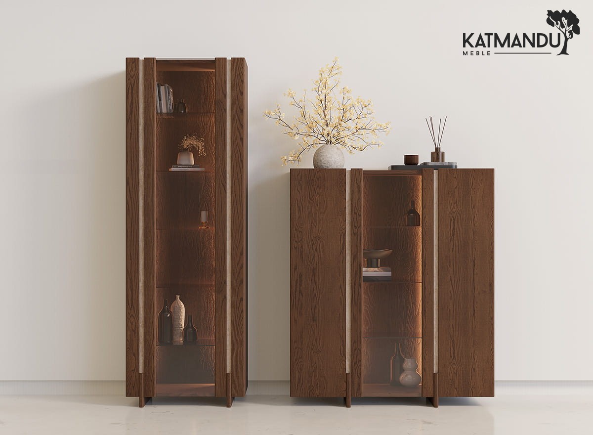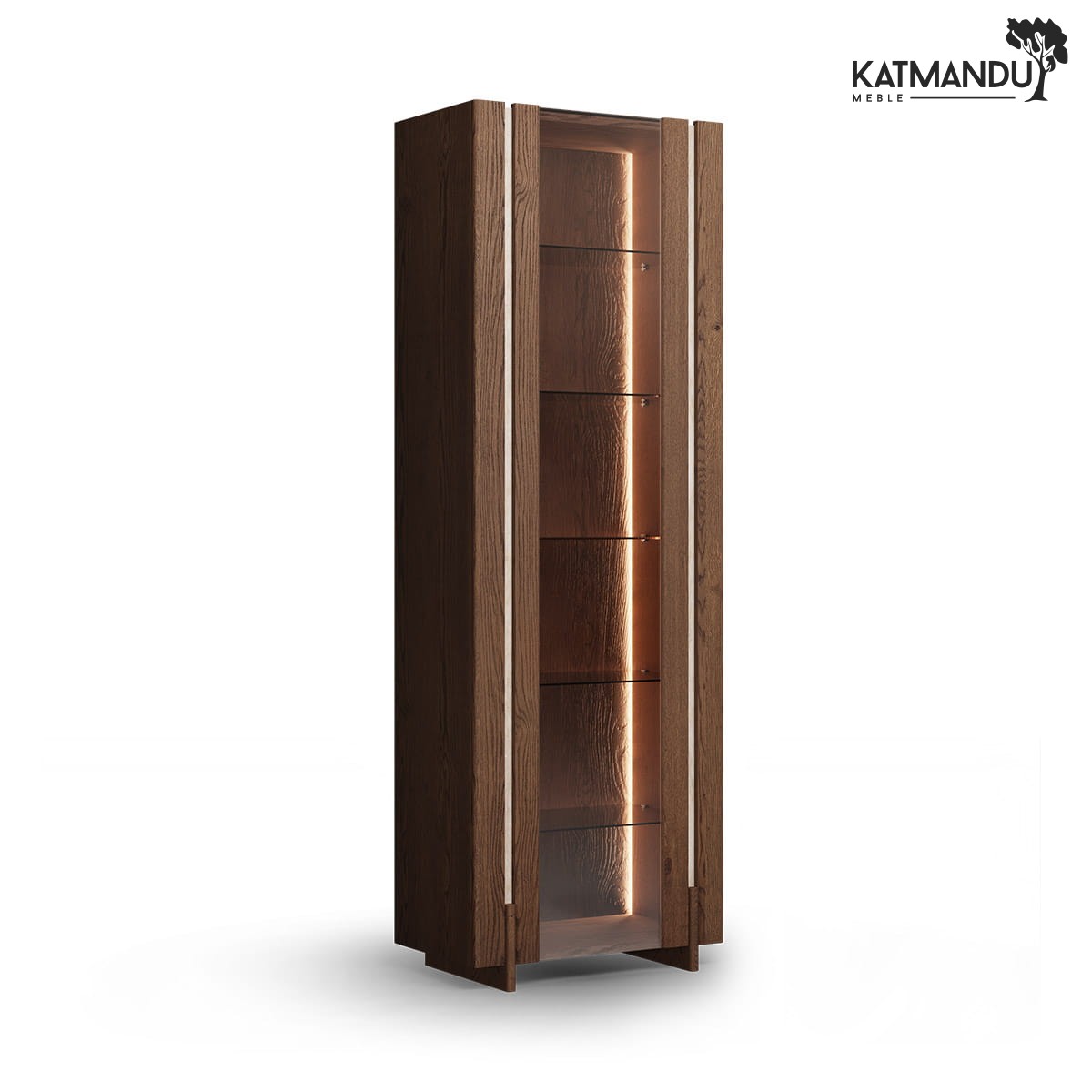 Witryna drewniana wysoka z kolekcji Tivoli w odcieniu tabacco została stworzona do przestrzeni, które wymagają dominującego akcentu – reprezentacyjnych salonów, gabinetów i apartamentów. Ciepłe oświetlenie LED za brązowym szkłem buduje wewnątrz witryny atmosferę prywatnego muzeum. Drewniana witryna z trawertynem z kolekcji Tivoli w wersji tabacco to najbardziej wyraziste wcielenie tej prestiżowej linii – obiekt, w którym drewno, kamień i szkło zapisują wspólną historię o bezkompromisowej jakości i sile formy.