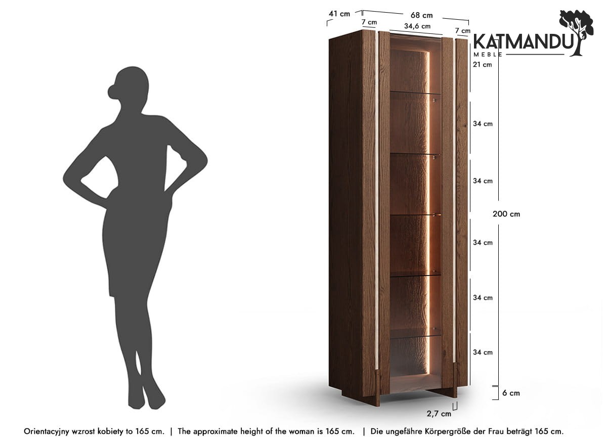 Wysoka witryna drewniana z kolekcji Tivoli w wybarwieniu dąb tabacco to mebel w najciemniejszym odcieniu w całej kolekcji. Głęboki, ciemnobrązowy kolor dębu nadaje smukłej bryle intensywność, która natychmiast ustanawia hierarchię w przestrzeni salonowej – ta witryna fenomenalnie definiuje wnętrze i przyciąga wzrok. Przeszklenie ze szkła barwionego w odcieniu brązu tworzy wewnątrz mebla tajemniczą, kameralną głębię, z której ciepłe podświetlenie LED wydobywa eksponowane przedmioty ze sceniczną precyzją. Wąska wstawka z naturalnego trawertynu kontrastuje z ciemnym drewnem jasną porowatością kamienia. Bryła jest minimalistyczna, a jej prostoty nie zakłócają uchwyty, ponieważ drzwi otwierane są na klik, za pomocą systemu tip-on.