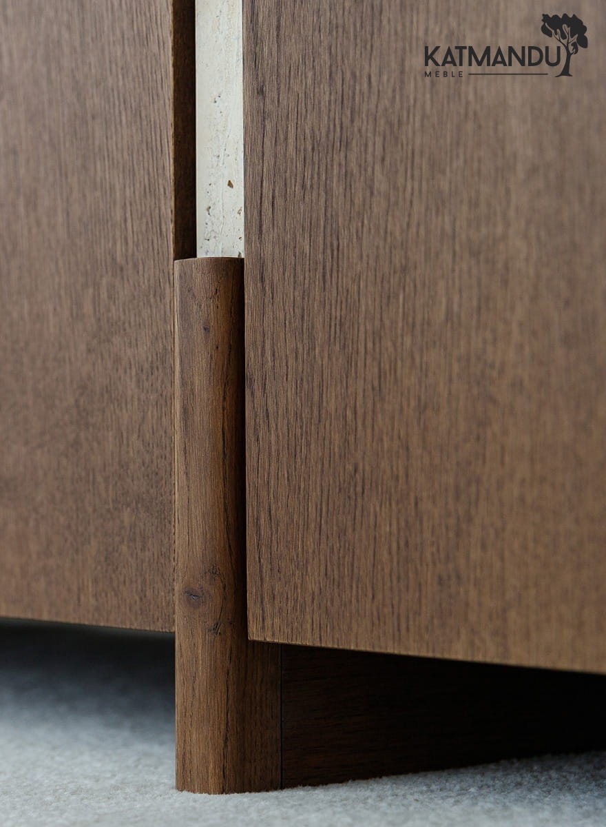 Lite drewno dębowe w najgłębszym odcieniu kolekcji wykończone jest olejem naturalnym, który penetruje włókna i wydobywa rysunek słojów z aksamitną intensywnością. Ciemna powierzchnia jest matowa, subtelnie zmienna w świetle i ciepła w dotyku. Szkło barwione w masie – zastosowane w tym odcieniu wyłącznie w wersji tabacco – nadaje przeszkleniu spójność z ciemną ramą dębową i eliminuje ostre kontrasty między jasnym wnętrzem a ciemną bryłą. Trawertyn osadzony w drewnie z absolutną precyzją jest unikatowy w każdym egzemplarzu – porowata faktura kamienia stanowi jasny kontrapunkt dla głębokiego brązu.